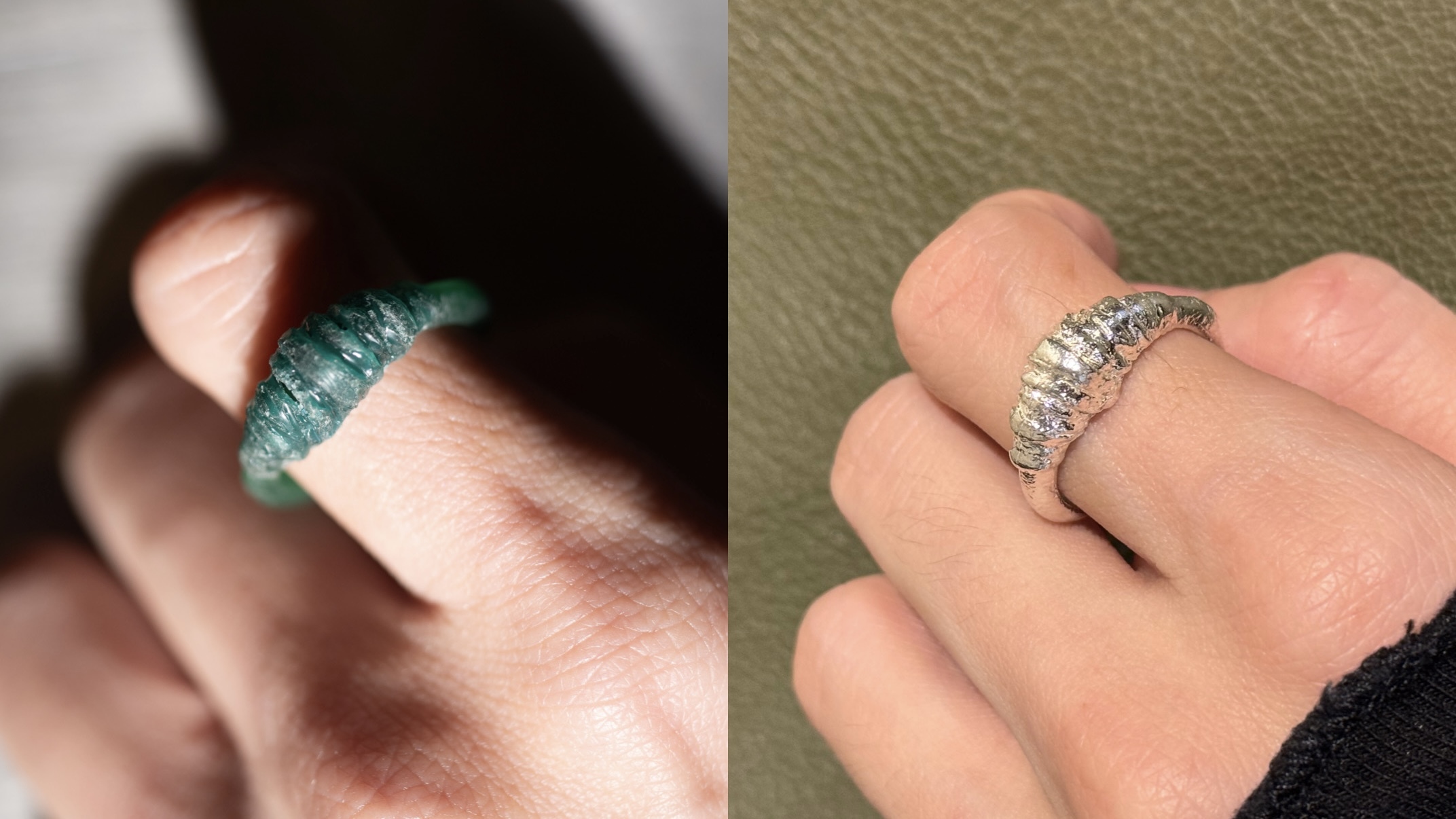 課程比較:✦ 硬蠟 Hard Wax質地模擬金屬本身堅硬質感,適合使用雕刻刀進行細節刻劃,也能透過溫度控制蠟的流動,製造出自然有機線條。硬蠟更能雕刻出接近金屬的俐落結構與銳利邊線,適合設計幾何線條、結構感、細膩輪廓等。🎯 適合追求細節精緻、線條精準飾品的學員。✦ 軟蠟 Soft Wax質地柔軟、可塑性高,類似黏土,可以透過手捏、堆疊、揉塑等方式快速建構立體造型。特別適合製作有富有手感的肌理、流動線條或具手捏感的作品,像是水波紋理、自由變化的結構等,讓創作過程更直覺、自由。🎯 適合希望透過手感表現創作的學員。-課程作品分享:可頌戒指-